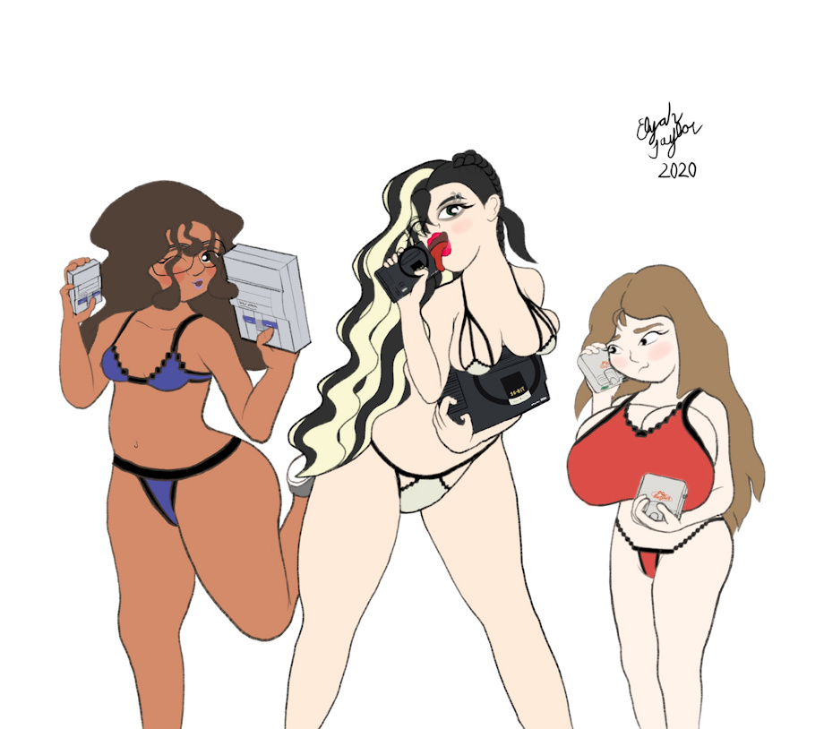 To celebrate me finally getting all 3 mini consoles based on the 16-bit systems from the 90's: the Super Nintendo Entertainment System: SNES Classic Edition (Nintendo's official name for it. Yeah, I know.), the Sega Genesis Mini, and the Turbografx-16 Mini, I thought it would be a great idea to draw my 3 main OCs, Eliza, Brass Bullet, and Chiha, with each of the consoles each one reps for. Of course, with Brass Bullet being British and Chiha being Japanese, they instead have a European Mega Drive Mini and a PC-Engine Mini respectively.