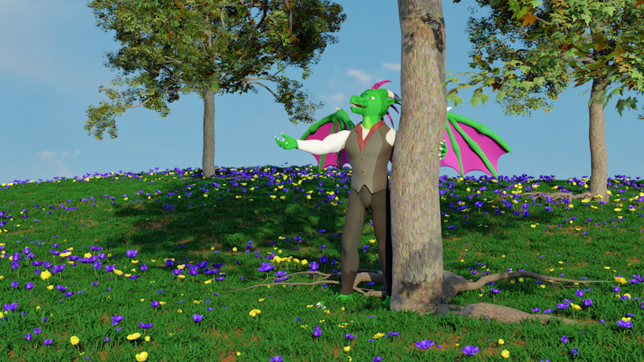 This is a quick scene to display a dragon model I made. I experimented with a few different designs, such as different hair styles, fins, spines, different outfits and colours etc, and this design was the one which I ended up liking the most. He may still need a little work, such as adding more detail to the clothes, but for now I'm happy with the way he turned out.