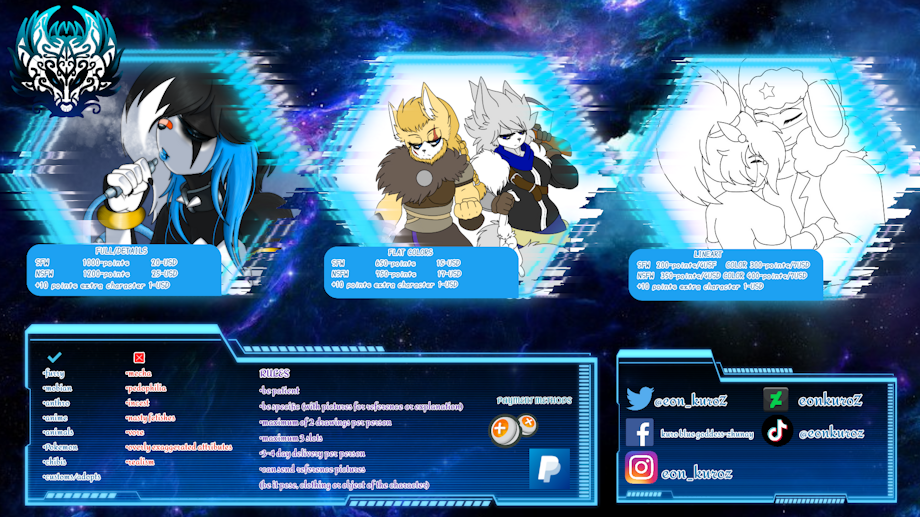 I open commissions, I accept PayPal or deviantart points .... Only 2 slots