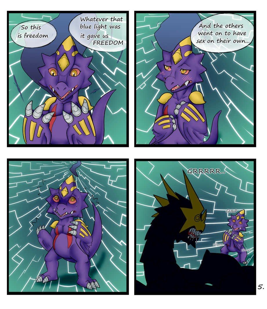 Monodramon awkwardly moves away from the free sex party only to find himself in a worse situation.