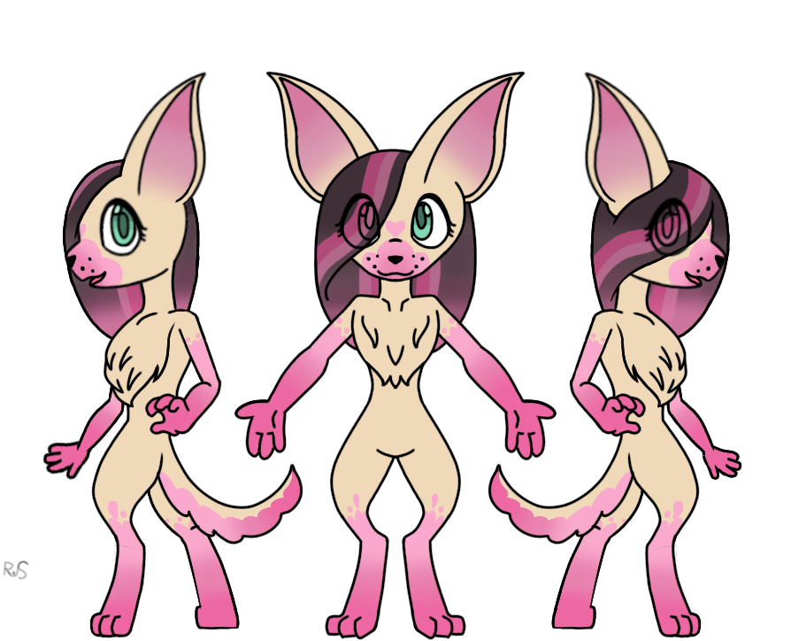 Pink fur/spots, aquamarine eye colour, pink shaded hair,