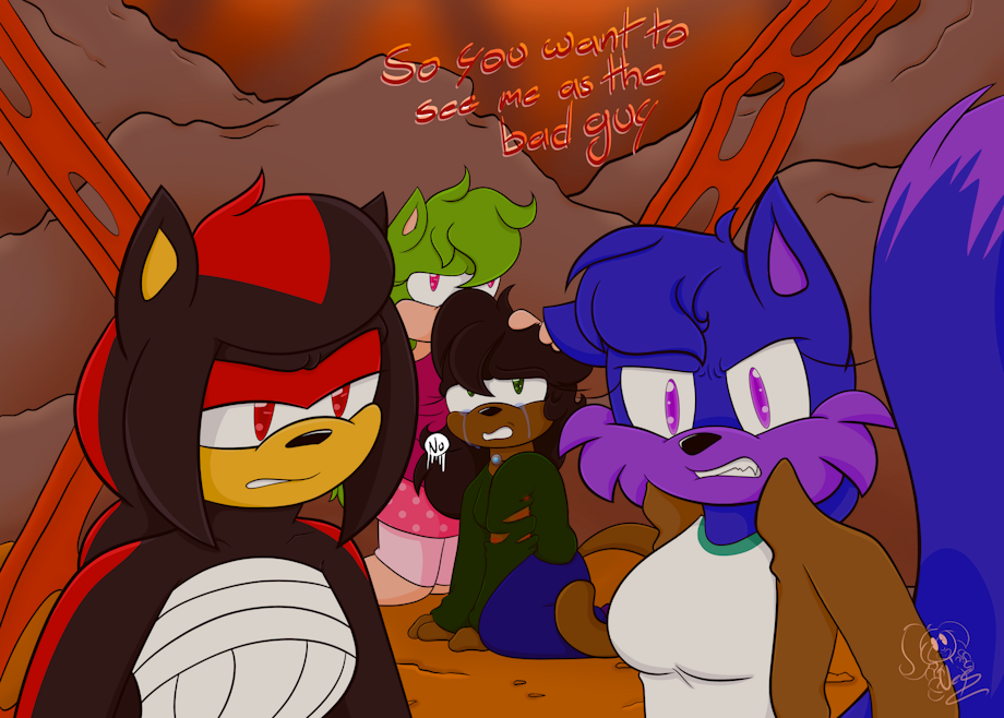 (I never really drew my ocs interacting with each other fully so I took the time to enjoy myself in this. If you follow me on Twitter I had posted a pic of what would happen if Sabrina met Infinite, it would not be a good team up. So her friends came in to save her and he takes advantage of he knowledge she shared with him to mess with her.)