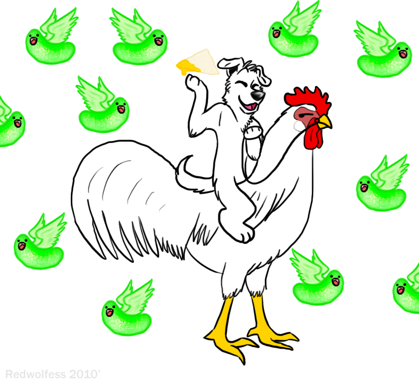 Them green things with the wings are supposed to be flying pickles [Yes I am aware they have faces], that dog is riding a chicken [rooster] and for the sake of my [in]sanity they're both white. [mostly] And yes....there's a giant hovering nacho. =3