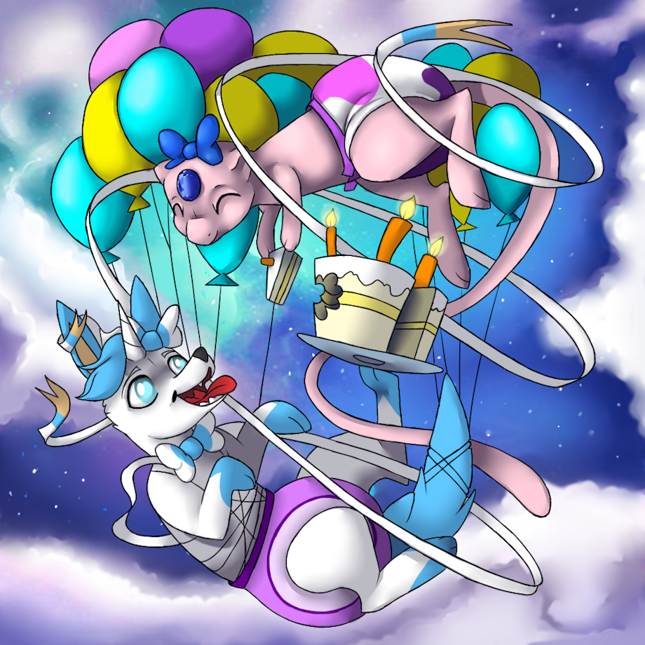An adorable picture by my friend Star of me and my character Abigail the Mew in the sky having cake to celebrate my birthday! I love it lots! Thank you so much honey!