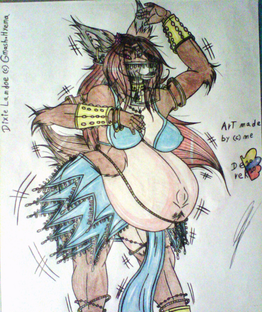 This is a drawing I did of Dixie Landoe (user character "Gnash.Hyena") who decides to entertain her husband with a little private belly dance performance