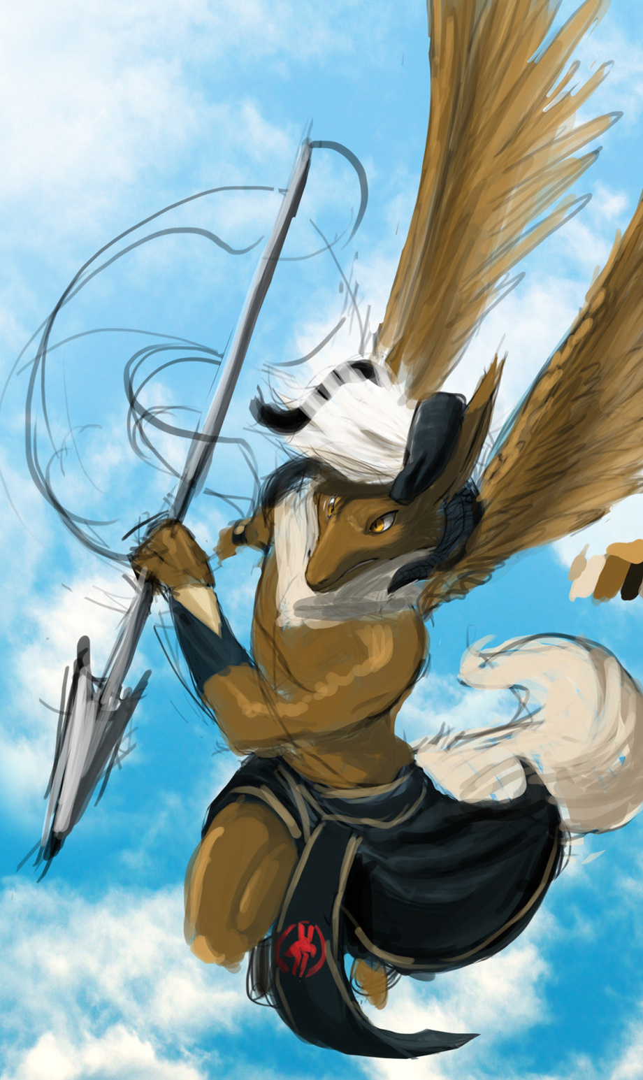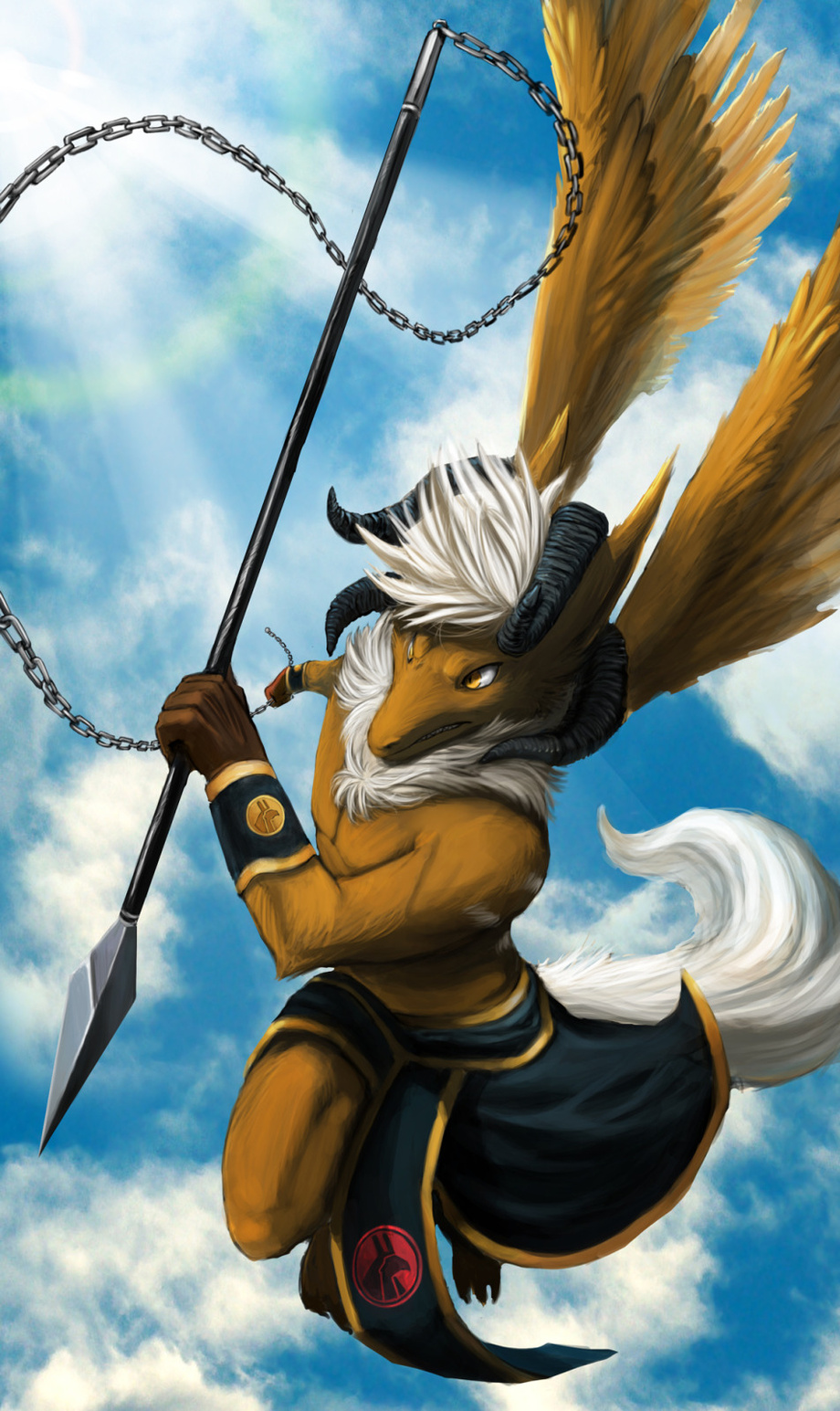 weapon: an ebony shafted spear used for impaling enemies from incredible hights equipped with a ridiculously long chain perfect for hoisting said impaled enemies into the air, and into his hungry embrace....