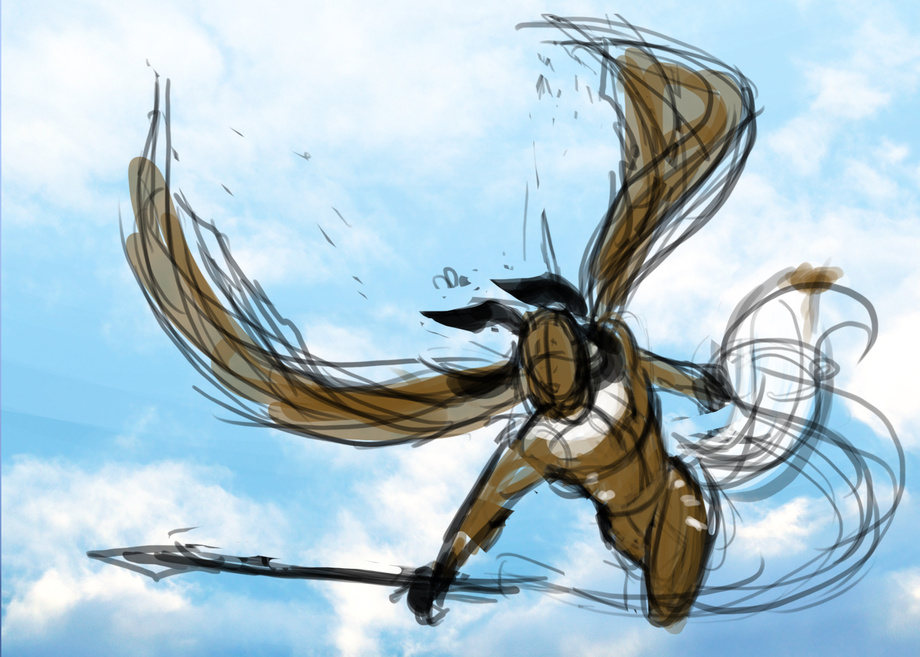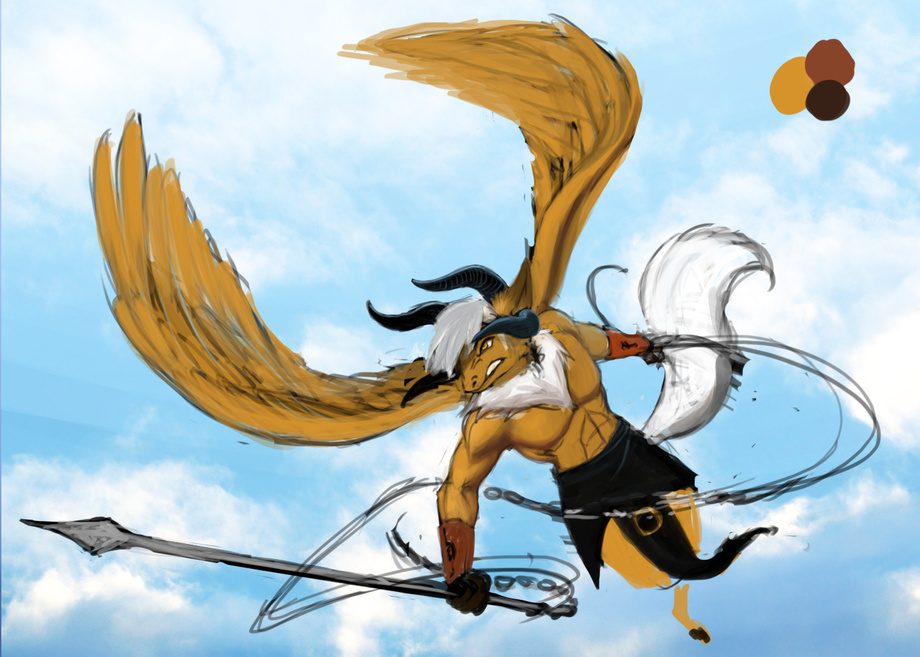 weapon: an ebony shafted spear used for impaling enemies from incredible hights equipped with a ridiculously long chain perfect for hoisting said impaled enemies into the air, and into his hungry embrace....