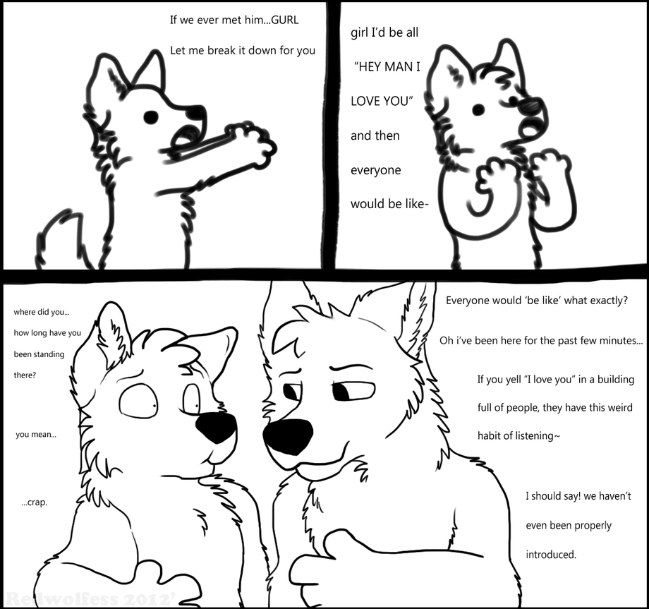 Daisy's friend had brought her to this conference center/mall area/thing, and I guess her favorite actor(?) was there for some reason, Daisy didn't know but her friend knew. Friend kept bringing up this actor dude, finally asking what Daisy would do if she got the chance to talk with/meet/hang wif' actor person. Top two thingies were her response, person happened to roll by, Daisy was so caught up in her fangirlingness she decided to yell "I love you" to this actor from across the building, but when person walked out of field of vision, Daisy thought he hadn't heard and her 'eternal embarrassment' moment was for nothing, only to turn and have the dude standing right next to her. ie= bottom panel. Person was super nice, even got a laugh over how many times Daisy and her friend apologized for the random outburst. Last she said, she's still mortified beyond belief.