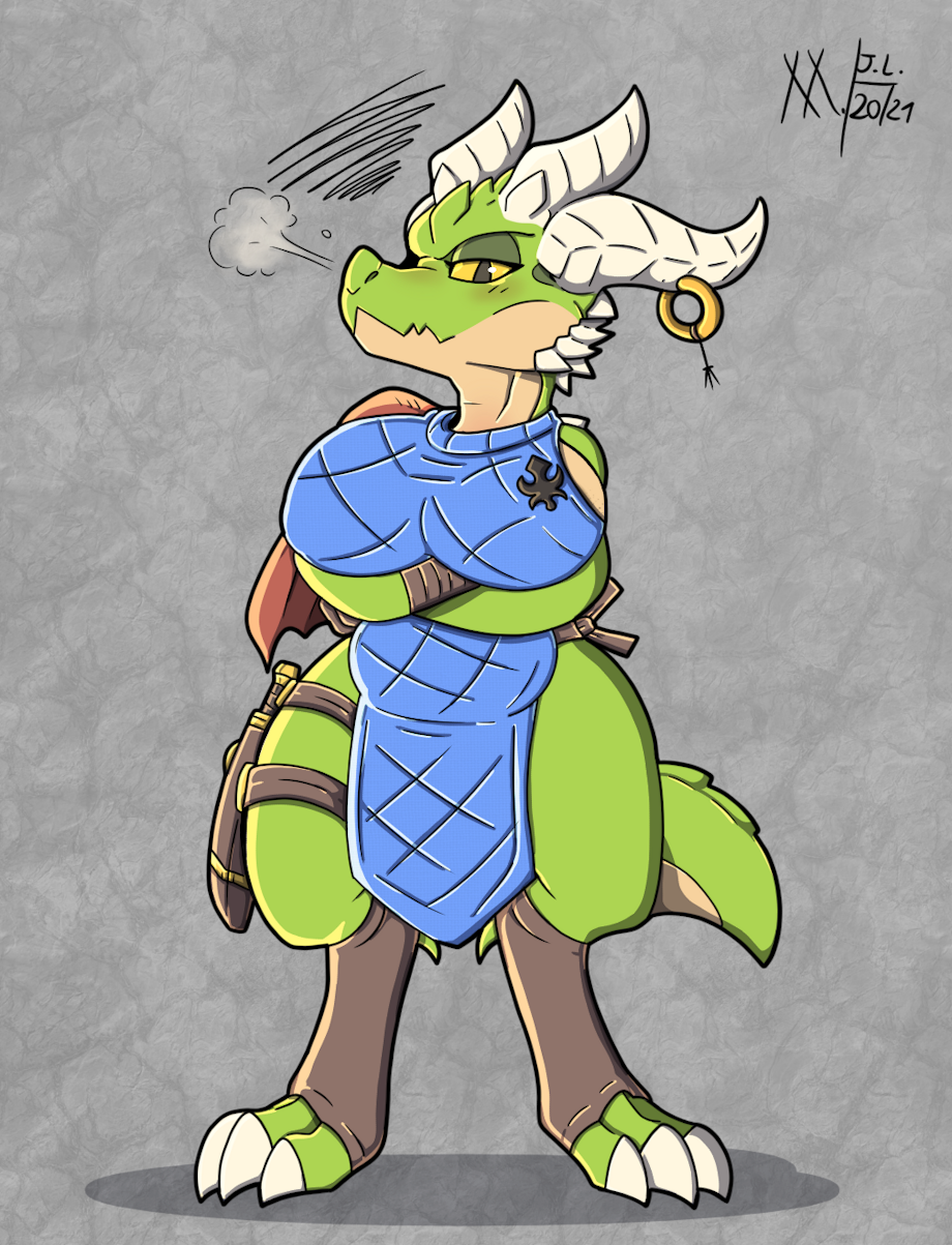 (this one took way longer than needed). Art of a kobold OC i made a while ago. her name be Draco Brevi Puella, she is usually a no-nonsense knight, but often her kobold nature shows up when next to some hunks, "the greed for meat", as some say.