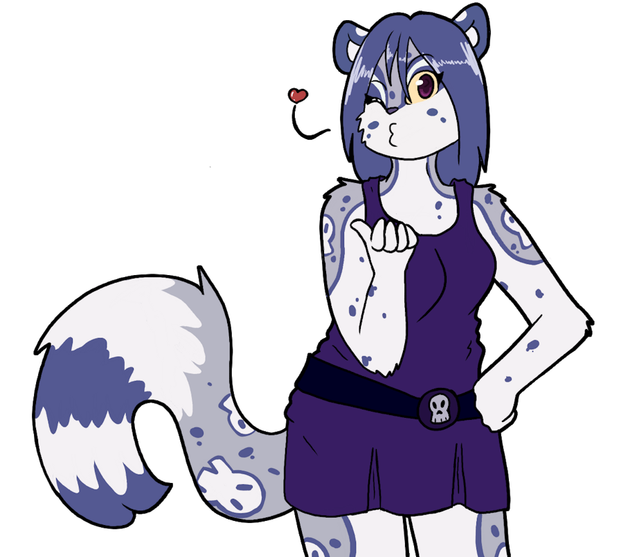 Safina is all dressed up for a night out! She blows a kiss in the mirror before leaving, wearing a cute dark blue dress with a skull accessory that matches her fur pattern!