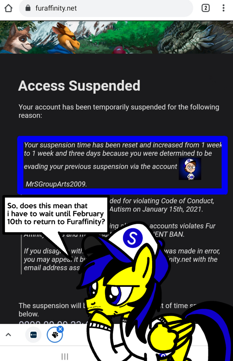 Okay, I am banned for a second time on Furaffinity because I didn't respect the Furaffinity ban rule. So I have to wait another week and three days, but on what date exactly?