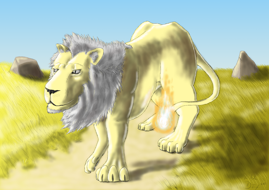 Done for an art trade with my long-time friend Aidan of his Fire Lion character Iarun, to appear in an upcoming novel. I'd never drawn a lion (Fire or otherwise) before so it was a fun learning experience, and the trade was a nice relaxed nudge to get me drawing a bit more. :)