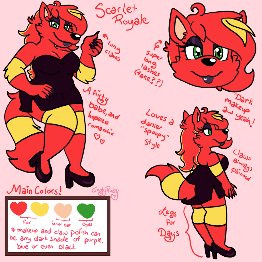 Scarlet is tall and very curvy, and her legs, much like any of her species, are strong and long. Strangely, unlike most maned wolves, Scarlet fur is almost completely bright red, with a few bands of yellow on each of her limbs, and "highlights" in her hair. This bright coloration is *claimed* to be natural, but the constant deliveries of hair dye at her home seem to indicate otherwise. Her eyes are a dazzling green, and her lashes are voluminous, though these also may be fake. Her claws are long and painted in deep purple colors, much like her matching eyeshadow and lipstick, which is always on.