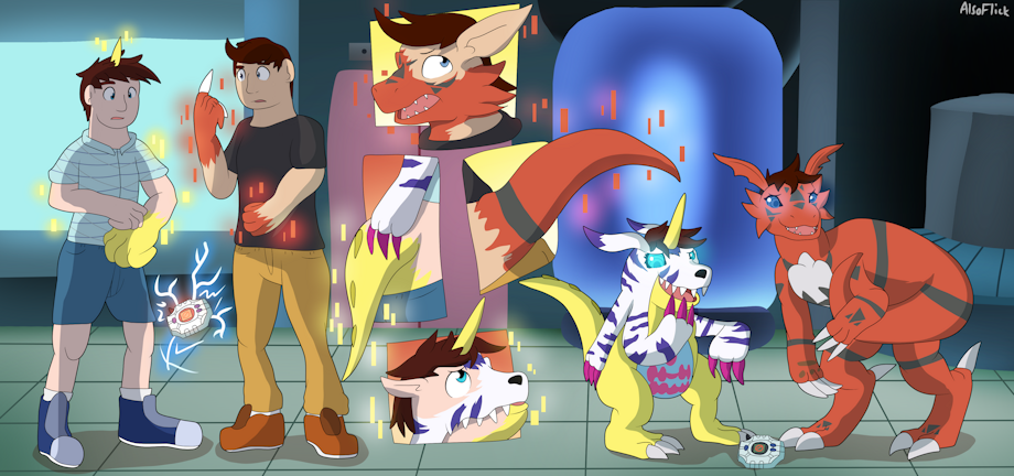 Seems that Ean and Diamond find themselves with a Digivice, the one they found corrupted them both turning them into a Gabumon and a Guilmon!