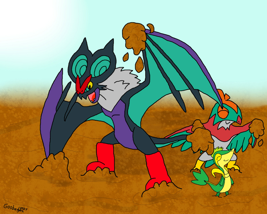 Squelch, squelch, squelch! Noivern, his red wellies and his pals Hawlucha and Jay the Snivy are ready for another muddy good year squelching about in their wellies. Art by @Badgerisadorabl.