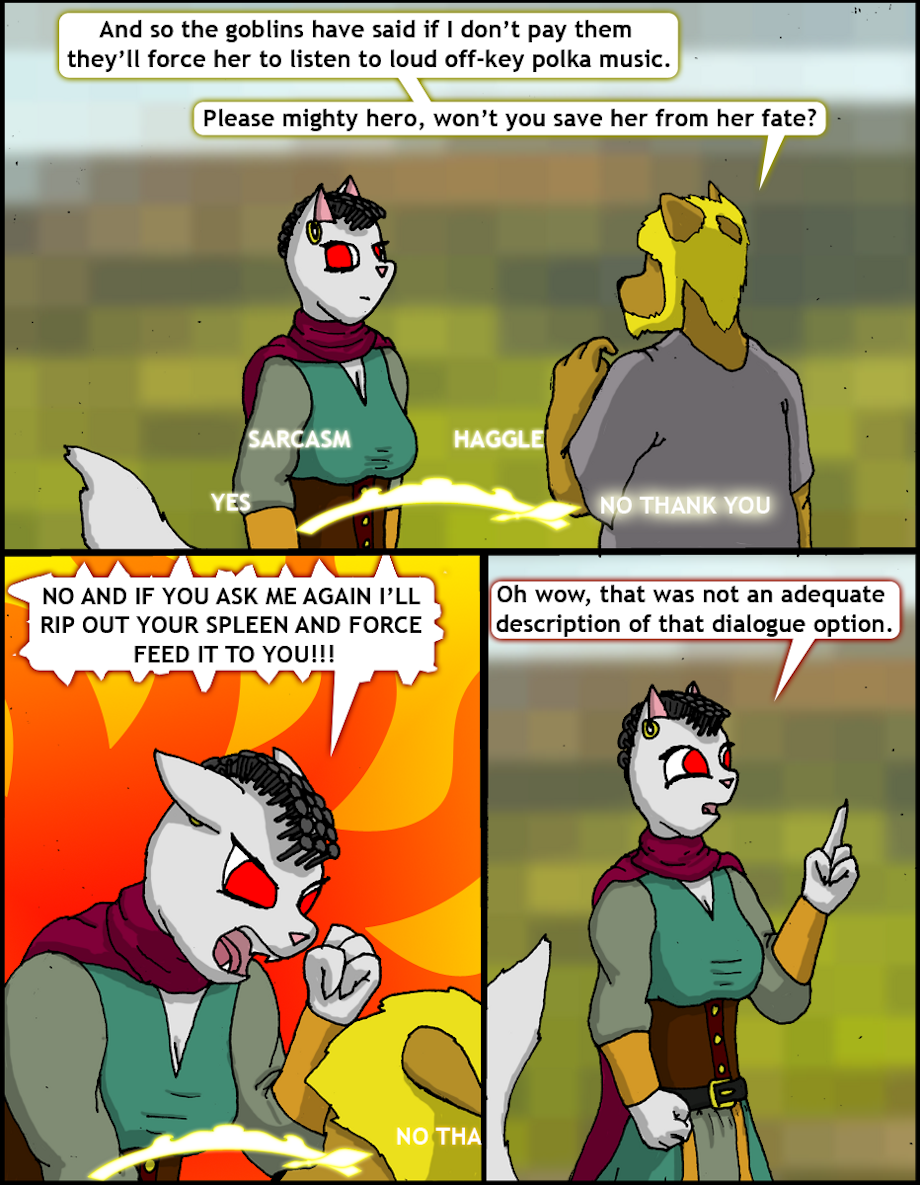 Sarcasm: Turns out to be yes but he gets confused and so doesn't end up rewarding you for rescuing her. Haggle: Turns out to get you a 5 gold raise but he also throws in the objective of punching out Glornax-devourer-of-souls as part of the bargaining.