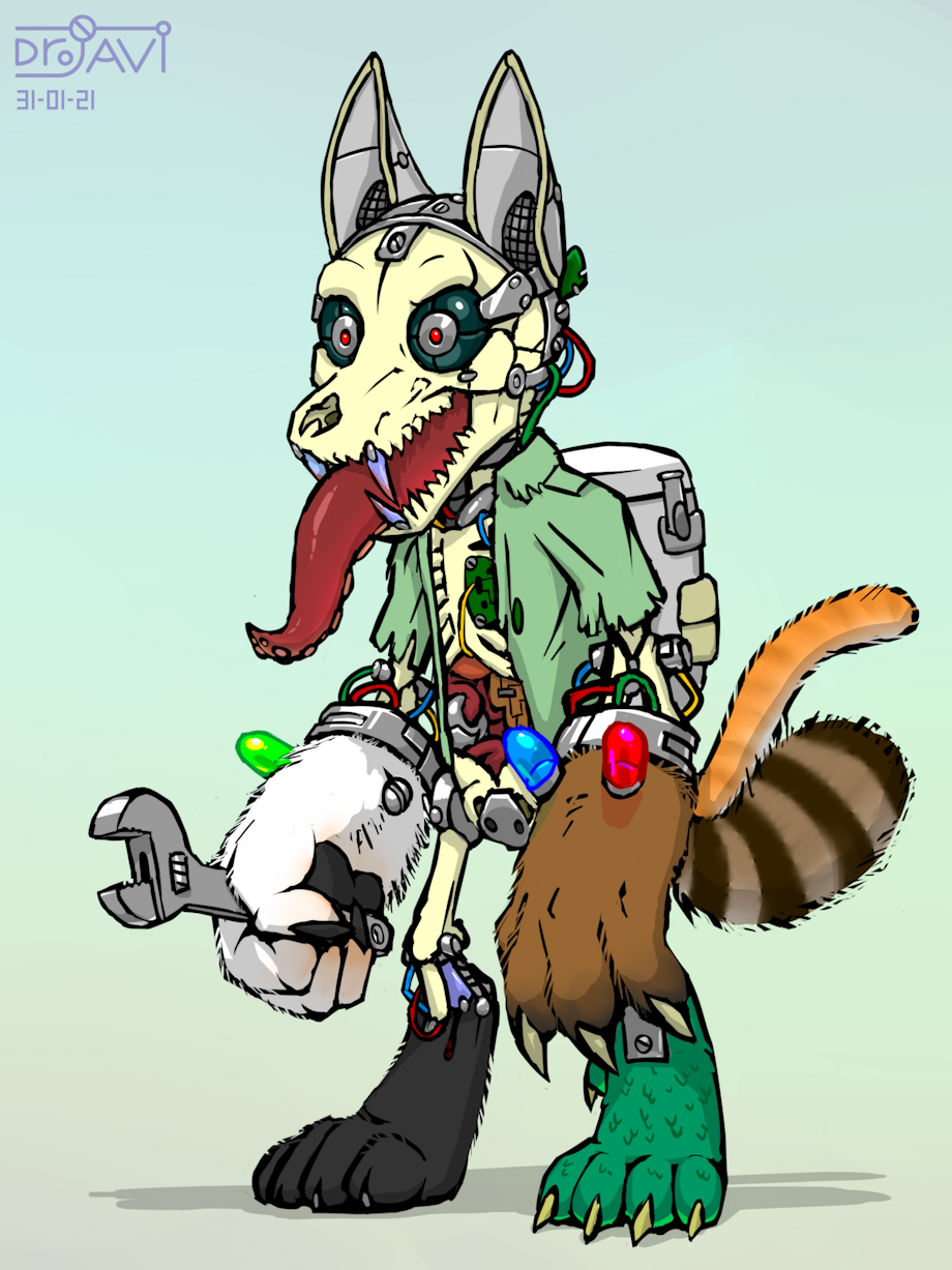 This is the Javi from the universe where Esperanza didn't survive the Extinction. Javi didn't die thanks to his bionic augmentations, but being functionally the last living intelligent being on Earth (or at least, in a really really large area), he devoted his immortal existence to frantic, mindless science, researching for the sake of researching, just to stay busy and not to give up to the despair of eternal solitude. This caused him to completely abandon all ethics, having no social rules to obey and often engaging in whatever brainless self-indulgence his lifeless body could come up with.