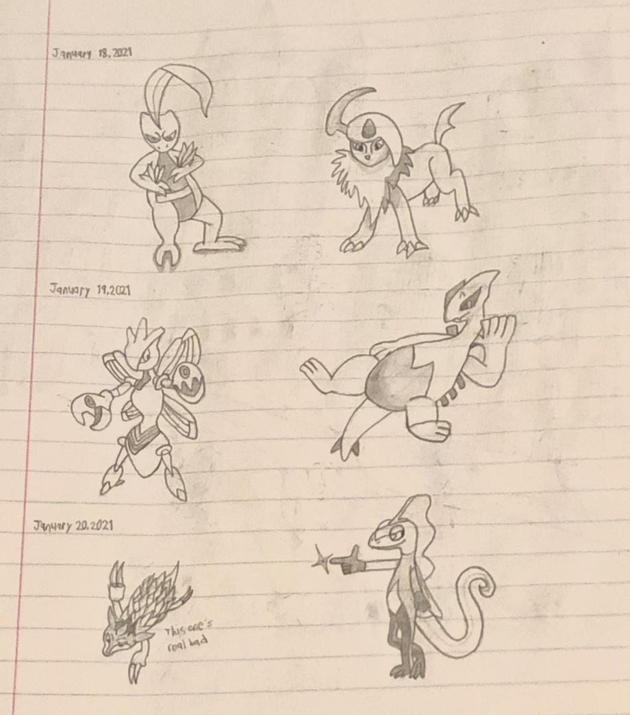 A set of pokemon drawn not-quite-at-random Unlike the ones that I had drawn quite a bit back in the past, these weren't completely traced from the original picture and I tried to draw them in my own imagined poses. Nothing too difficult, of course. Sandslash is terrible, though.