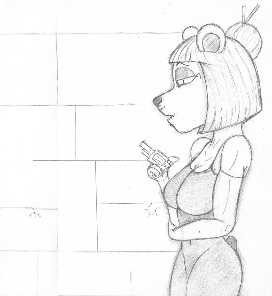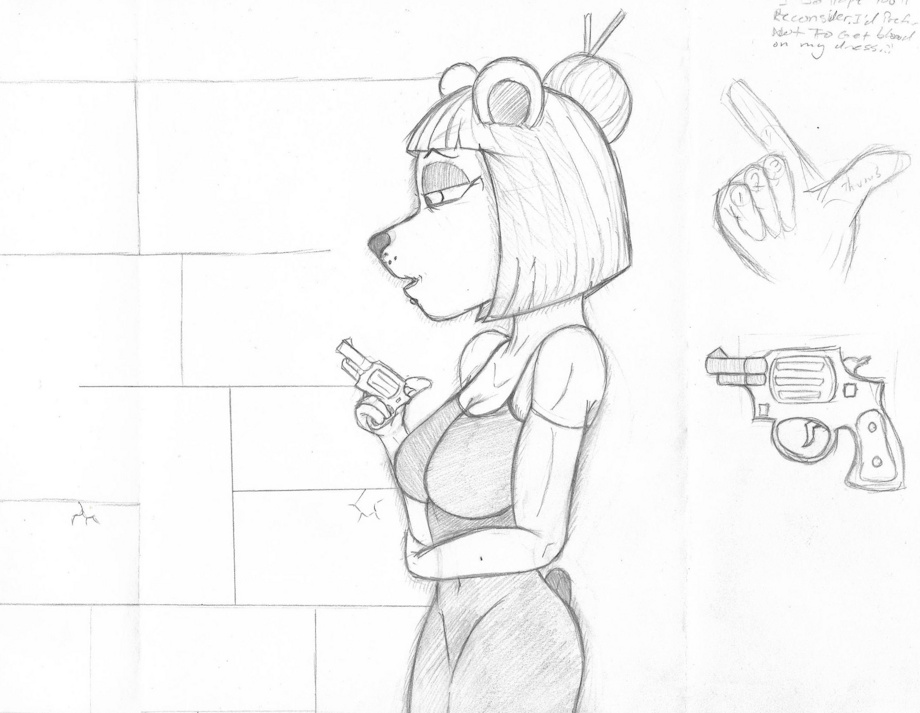 Even after trying to fix it several times I still hate her hand, and the gun. I wanted to have her holding it more casually to the side but I just couldn't find a proper reference for it.
