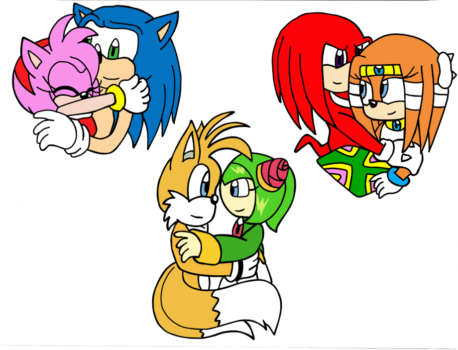 In this pic three of my favorite Sonic's couples: Sonic x Amy, Tails x Cosmo and Knuckles x Tikal appear sharing a cute hug.