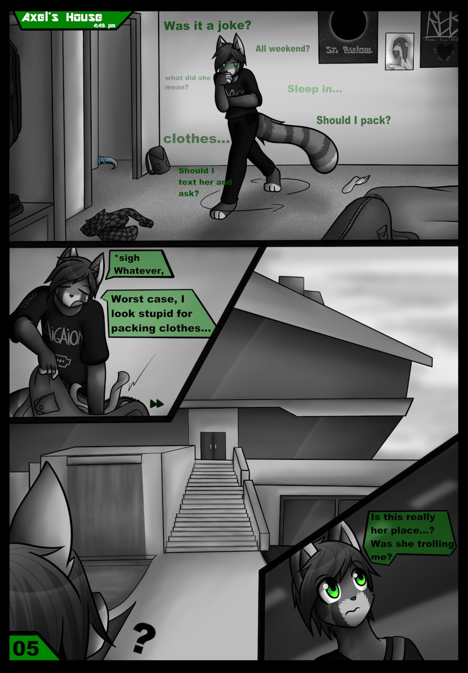 AWWW!! Hey, we can't say he didn't try to impress her in his own unique special way! ;3 I have a feeling this proposed sleepover might get a bit... ... ... colorful. <3 Her face in the 3rd panel, top-right corner - completely hilarious. She's NOT an impressed folf. lol I love all the little details in this page: his Aigaion shirt, the poor heavily-ignored teacher rubbing his head in distress, Kayla's super-cute outfit and lovely long-flowing hair... all shaded with great care and precision. Wonderful!!