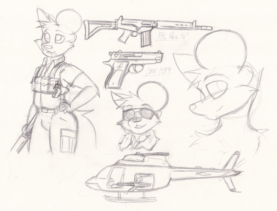A few sketches regarding Jacob Daly. Debating on whether or not to give him a shorter FAL or stick with the 16" version seen here. Also included is a possible Kiowa for the mercenary group.