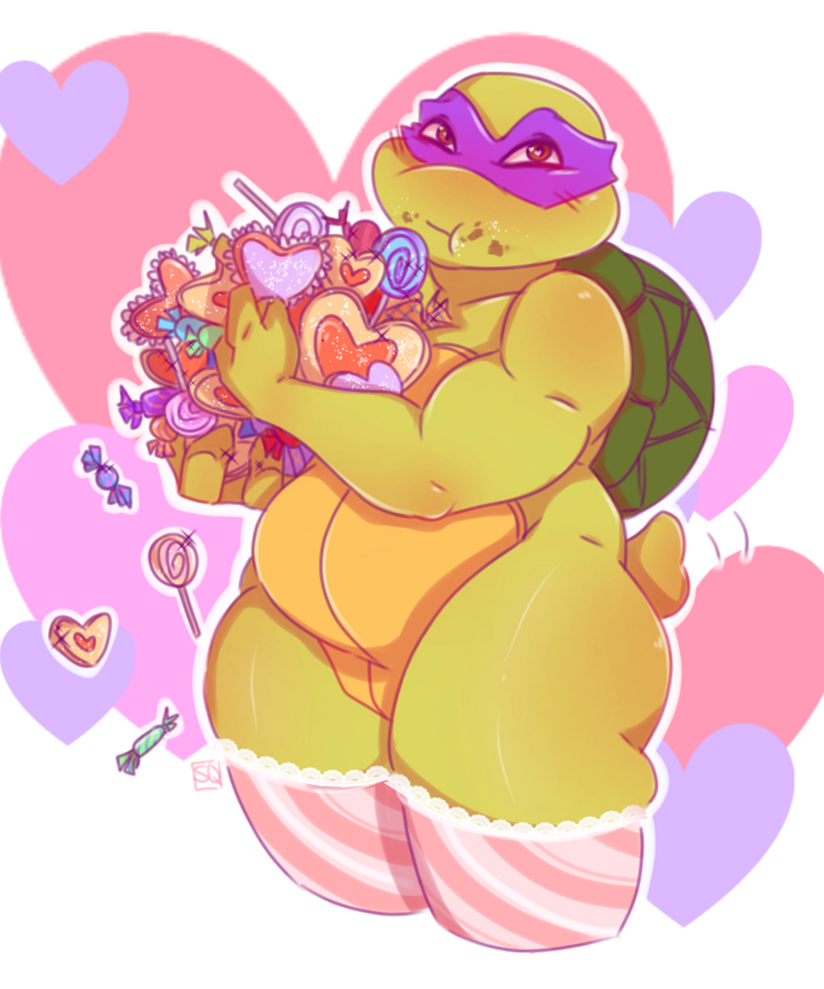 Sketch, this is so sweet! Thank you! I love the soft and bright colors, his big thighs and how he's got his mouth full of sweets already, hehe. The way you draw characters always feels so lively, it definitely put a big smile on my face to see this chub Donnie in your style~ <3 Thank you so much!! :3