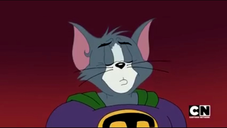 In the beginning of the Tom and Jerry Tales episode "Power Tom", Tom has a dream that he is a superhero. Tom is wearing a tight purple suit with a yellow symbol of a "T", dark purple briefs, a black belt, and a green cape. It looks kind of hot on him...