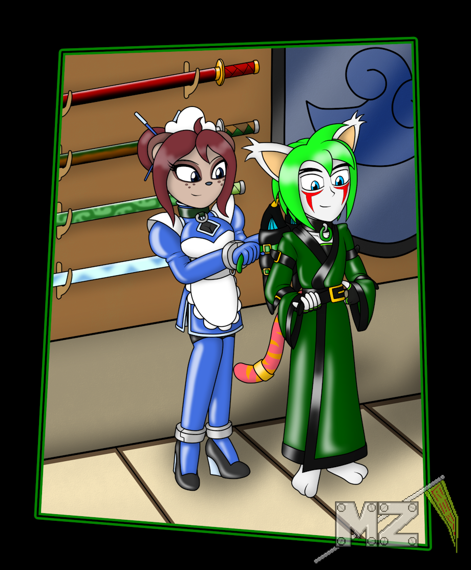 of Maid Dryad and Prince zaki about to do some Sparing. Right now there prepping and gearing up as Dryad helps Zaki get his wing binders on.