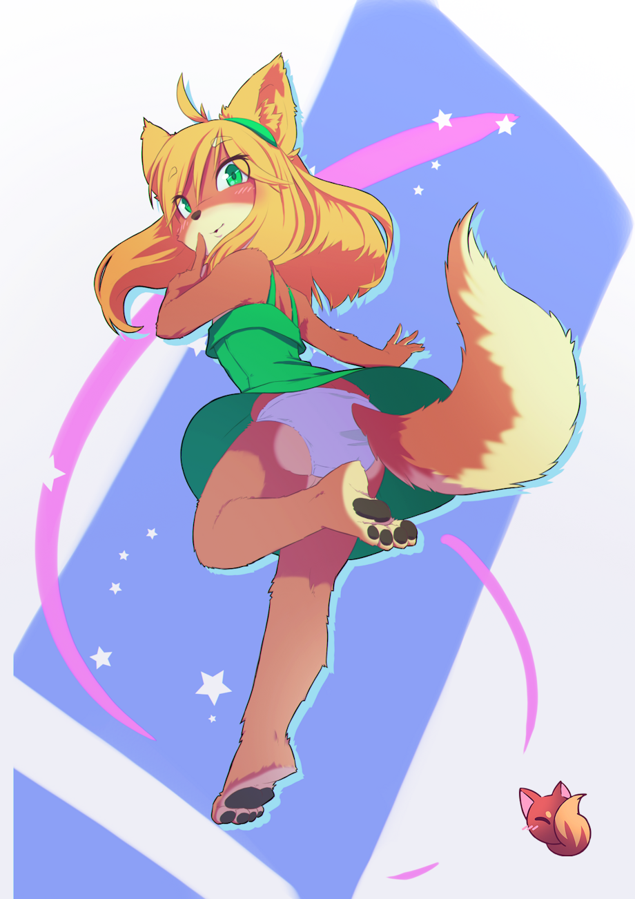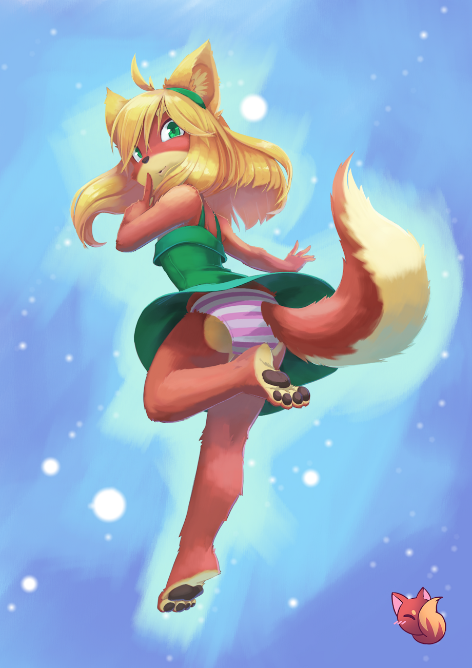 She's such a pretty little vixen, and I love her outfit and that playful, mischievous attitude, too. The detail on her hair and her big, fluffy tail is beautifully done, and I love how her green headband and dress match her eyes. She's a gorgeous character all around, and you've done a fantastic job with her!