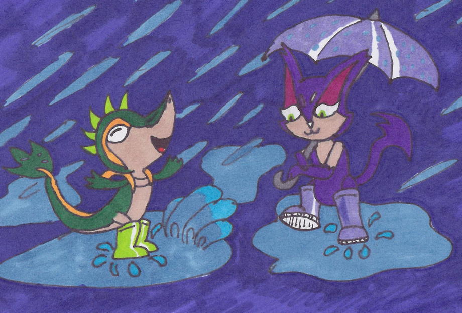Jay the Snivy having fun with his friend Purrloin splashing in puddles with their wellies.