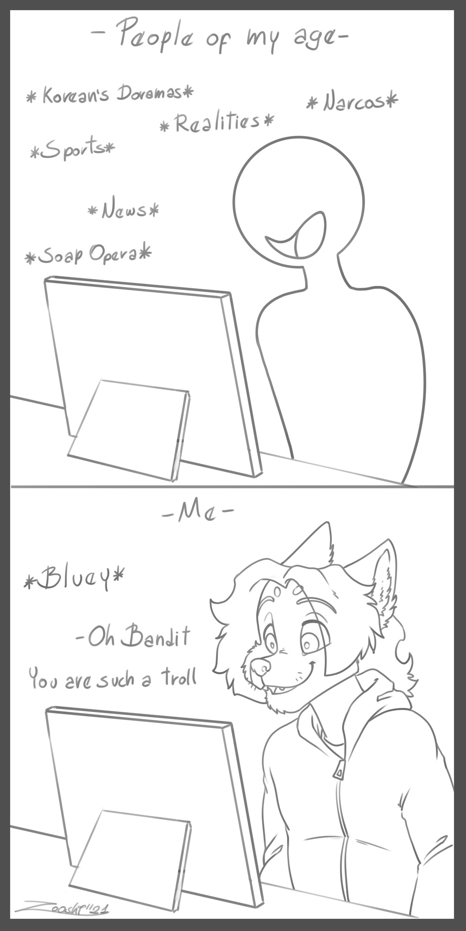 This is me as well. I still mostly watch cartoons, even ones for young children as long as it has cute furry characters. Bluey is exceptionally good, and not just because the characters are cute (though that is definitely a bonus).
