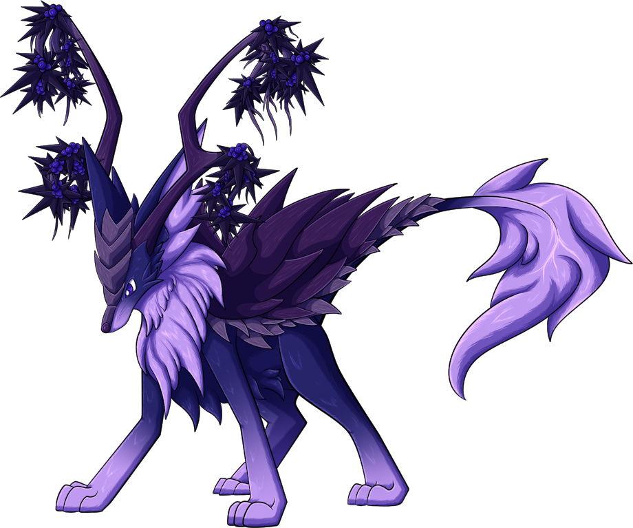The Barkback is a doglike prey animal that seems rare only due to its ability to hide. This strictly herbivorous mammal not only has thick plates of bark forming an interlocking shell on its back, but also is covered in plant matter—for most of the year, these plants lay dormant, but when "in bloom", females (called does) carry flowers in their ears and manes while males (called stags) have berries hanging from their branch-like antlers. They are social creatures, forming herds as large as food availability will allow. However, they are extremely skittish, and the approach of an unfamiliar creature will cause it to curl up, protected by its shell.