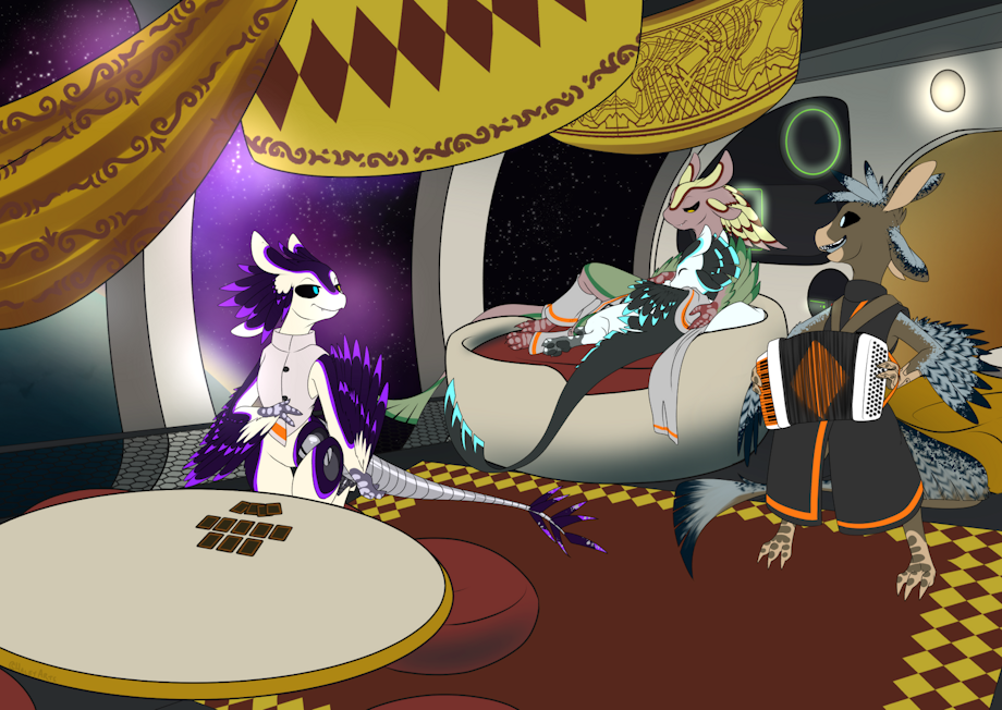 This crew of Avali enjoy some leisure time between warp jumps aboard their starship.