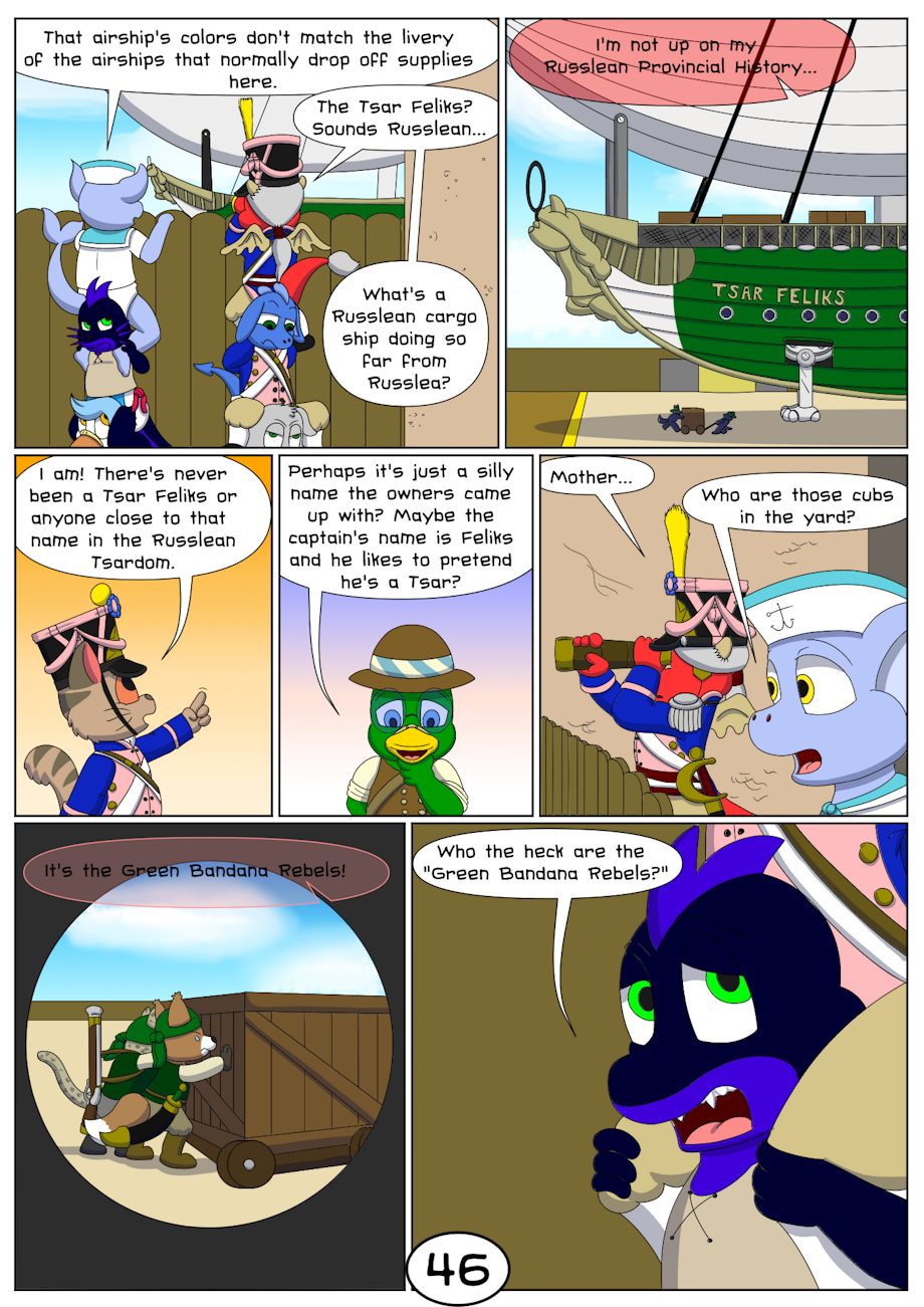 Page 45 Panel 1: Tacki is on the left side of the panel, his arms wide to emphasize the point he is making in talking to Yosheo on the right side of the panel. In the bottom middle of the panel just barely visible is a view of Temple's sailor cap, ears sticking out. Yosheo: We have a saying in the media. It’s only a slow news day... until it isn’t! Tacki: I hate to break it to you, but we’re only here because it’s snack time. Truthfully, a closed Cookie Princess doesn’t warrant military intervention.