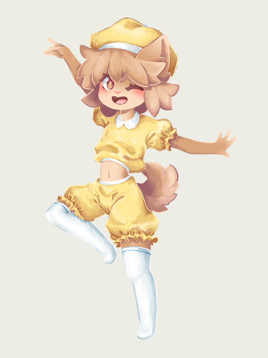 Cute matching yellow and white hat, shirt and short with matching white knee socks and sometimes yellow flats(shoes).