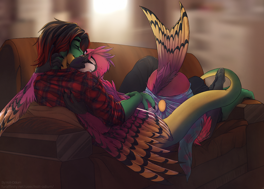 Sometimes it's just nice being able to snuggle up real close to someone. Doesn't really matter the reason why, as it's always just as lovely nonetheless! And oh, would this just be the perfect place to do that, with her hissy lizzy. All draped over him in his couch, just sprawled atop and holding on real close, as Icarus happily returned the favor! Such a sinister lizard, in such a cute and fluffy little scene! One certainly wouldn't imagine this to be his pastime when first getting know of everything that he gets up to... But hey, looks can be deceiving, no? Besides, there will be plenty of time for all that jazz later. For now, it's all about snuggles~ <3