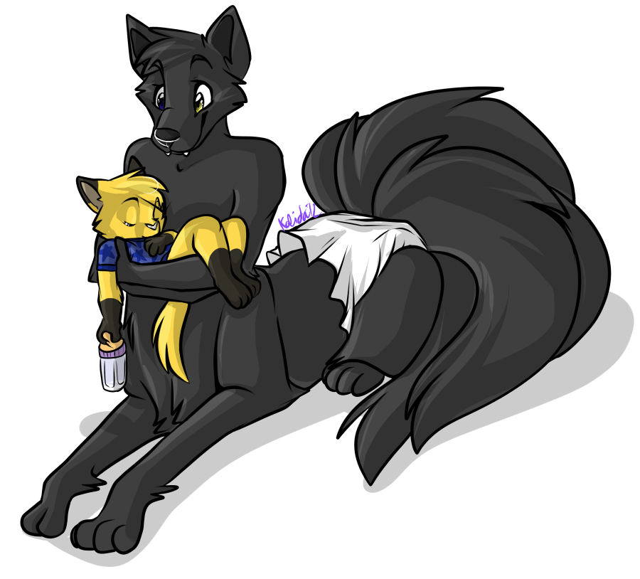 :3 After a night of running and playing (and a nice warm bottle), It seems sleep has finally caught up with me and won. Luckily a good friend (who I’ve become attached to like a big brother) is there to tuck me in. *Snuggles into soft warm wolf-fur*