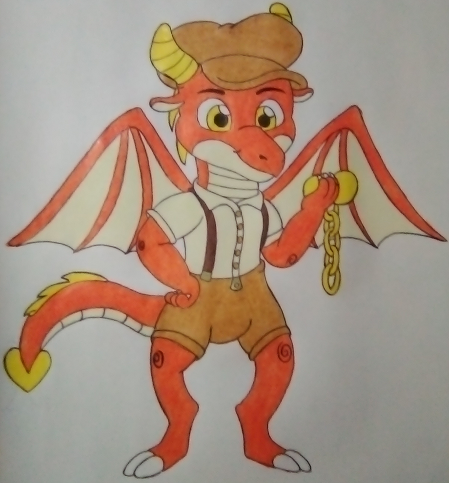 This is Reginald Tymer, a 14 year old dragon who helms from the old fashioned world of SteamPunknia, a land in modern day set in the ancient time of the early 20th century, filled with unusual flying machines, pipes and steam that powers everything in their world. Reginald works in a clock shop where he messes with cogs and gears, fixes clocks, and has a deep fascination with time that he is in the works of developing a stopwatch that can alter the affects of time when he uses it. He dones a young mans newboy outfit (quite similar to Scout and Martha) and is always carrying around his pocket watch.