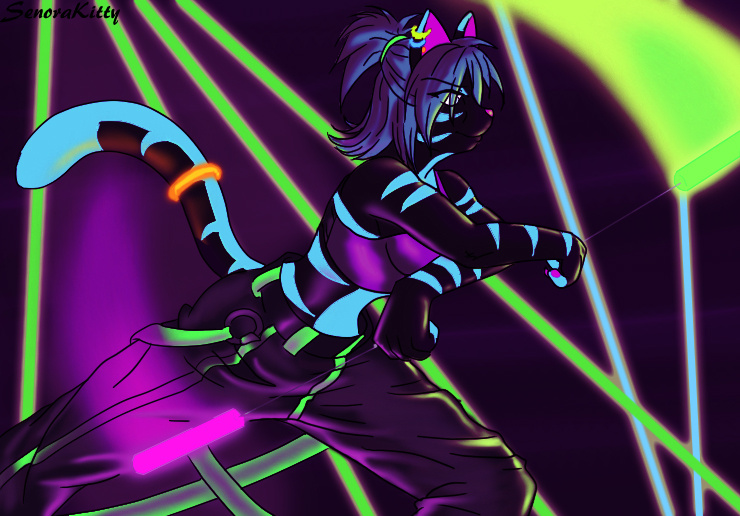 This is the best version of this pic yet. I added more to the background, and put a glow in the dark band on her tail to add another light source for highlights. A friend mentioned how they liked how the original had a glow following the glow sticks so I added some new ones in