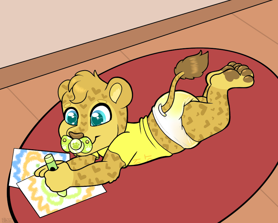 Tatertot drawing and coloring some lions with his crayons