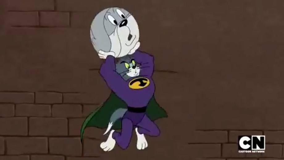 In the beginning of the Tom and Jerry Tales episode "Power Tom", Tom has a dream that he is a superhero. Tom is wearing a tight purple suit with a yellow symbol of a "T", dark purple briefs, a black belt, and a green cape. It looks kind of hot on him...