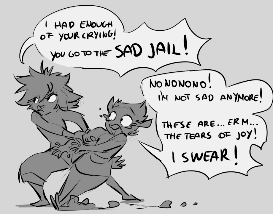 I like to imagine Sad Jail in this case is a comfy blanket/pillow fort with various favored foods and drinks and a nice tall stack of books within arms reach. :3