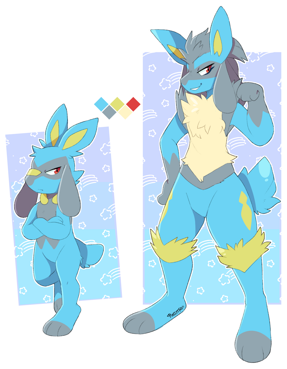 Fusion reference for @SomePerson_FGC, they are a scorbunny/riolu and cinderace/lucario.