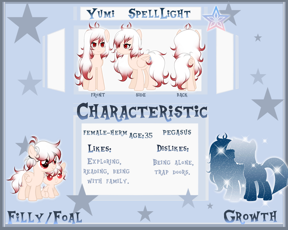 Yumi SpellLight is not your everyday Guardian she likes to Explore the Runes of the old world she searches for the Relic's of what she called "The Golden Age" of pony kind that was what led her to her future wife Asuna Hidden Treasures and to start a family with her till the day she disappeared on a mission to Manehatten to a place only known as the "Vault Of Glass" to this day no one has heard from Yumi SpellLight but her family still holds out hope