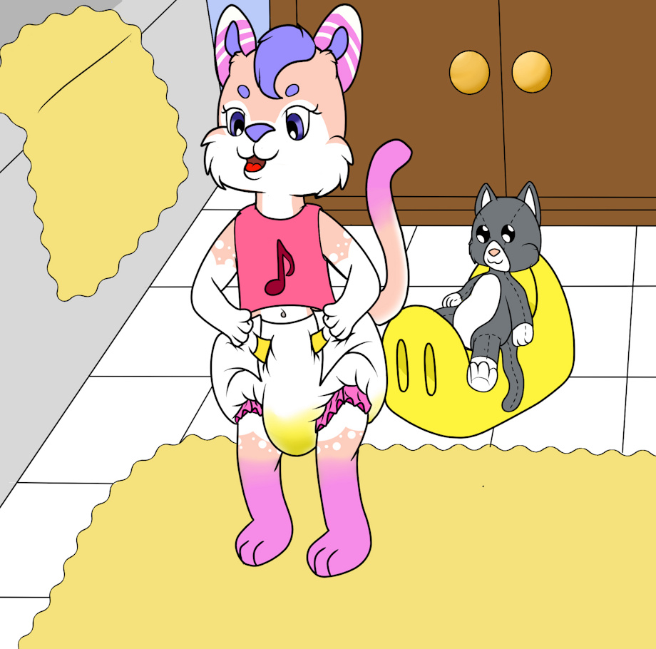 Penny was about to go pee in her potty but she sees that her kitty plushie was using it. So she decides to let her plushie keep using it and she can simply go pee in her diaper instead.