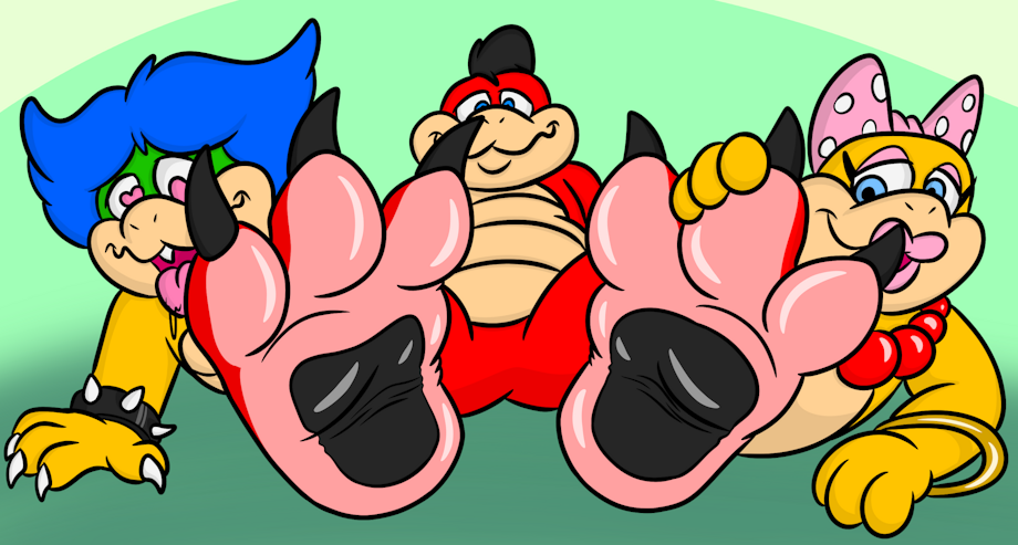 a simple pic featuring a koopa version of matt about to have his paws played with by ludwig and wendy