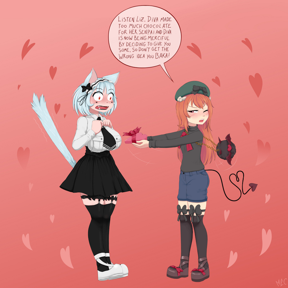 , """Begrudgingly""" giving cat girl Liz a box of chocolates for Valentine's Day, I mean it's just because she had too much, what reason do you have to doubt her?