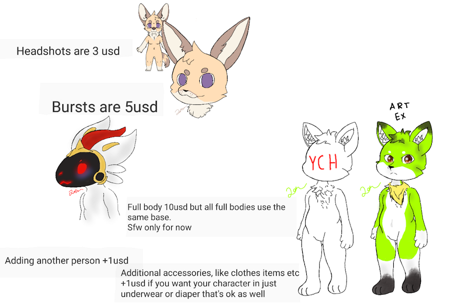 Well so I thought about it. I'm starting to do commissions, I'm starting small with prices. With drawings it can be any species as long as it's not to complex. I'm not good with backgrounds so they will be a basic color with your choice. If you aren't satisfied you can ask me for changes and I'll fix it
