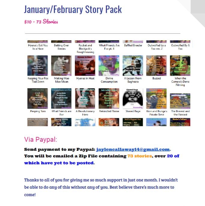 Payment will be made to my Paypal at jaylencallaway14@gmail.com. It’s best to mention “Story Pack.” The emails that appear will be sent the stories in bulk via emailed Zip File.